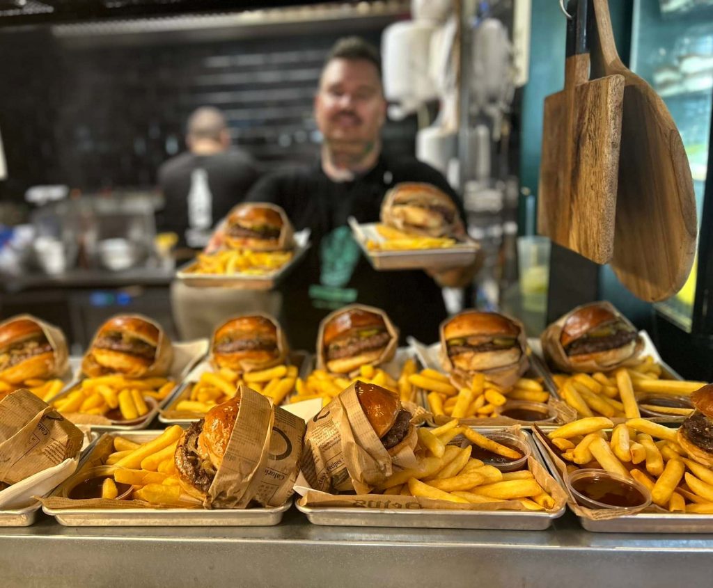 Nincs is jobb egy kiváló burgernél egy tó partján a naplementében, egy harapás a habosra kelesztett, buborékos tésztájú pi...