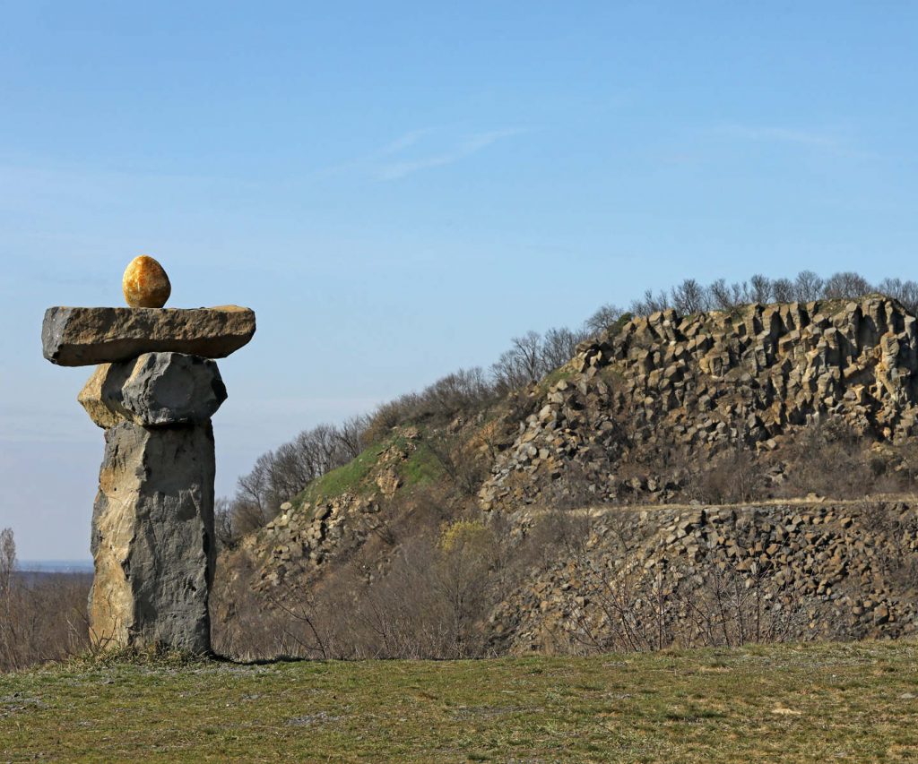Mint darabolt grafitceruza belsők sorakoznak a lecsonkolt kődarabok a Halápi-tanösvény bányakráterében.