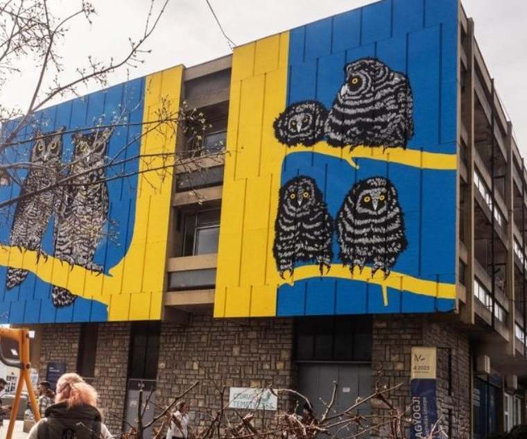 Leleplezték a Hotel Veszprém falára készült erdei fülesbaglyokat több emelet magasságban ábrázoló festményt.