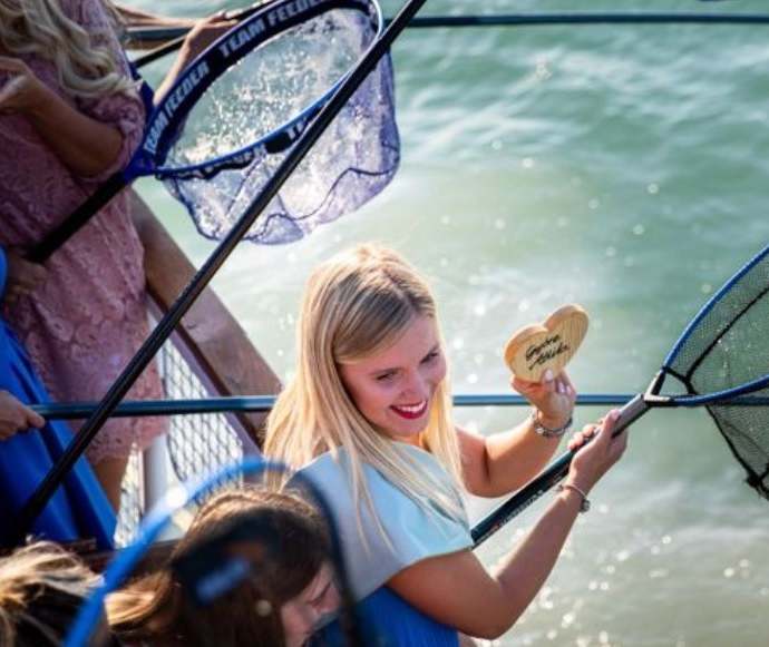 Kitűnő hangulat mellett és nagy izgalommal halászták ki a lányok a Balatonból a fából készült szíveket, melyekre ráírták v...