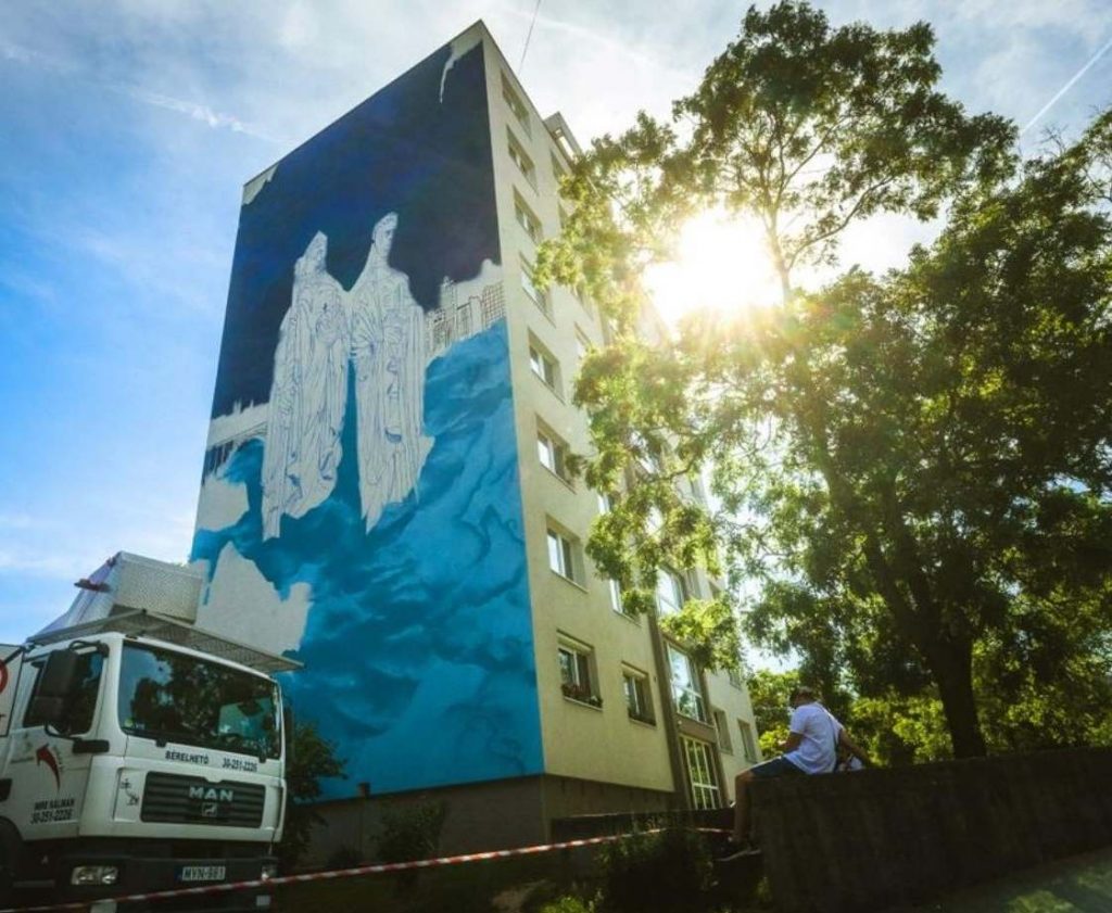 A viadukt, István király és Gizella királyné díszíti a nyolcemeletes ház falát. Gyere, nézd, milyen szép lett!
