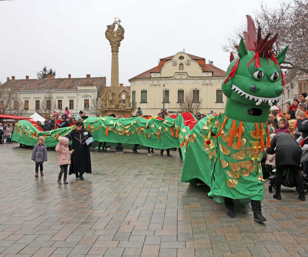 A városi karneválon óriás sárkány, dobosok, hercegi pár, borbarát hölgyek, bohócok, boszorkányok, medvék, Shrek, kalózok, ...